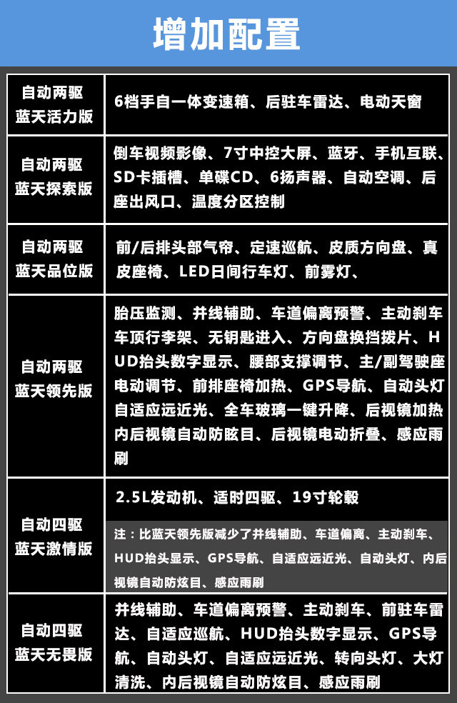 低配的蓝天活力版肯定不推荐,往上的蓝天探索版增加的配置基本满足刚需,但是再加9000到蓝天品位版,安全配置更加齐全,真皮座椅、雾灯和定速巡航也是很实用的配置,所以教授认为蓝天品位版性价比更加好,更加值得推荐。2.5L的蓝天激情版,配置与蓝天品位版相近,还多那么几个配置,而2.5L发动机和四驱的加持,开起来可是爽快多了,同样给五星推荐。