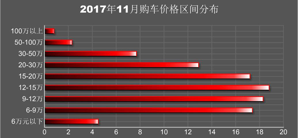 在前几年的购车支付方式不够完善的时候,人们多数以全款购车为主,要是选择分期购车也只能选择去银行办理繁琐的手续,所以当年的购车价格范围分布在6-12万上。但是购车的群体逐渐发展为年轻的趋势,生活在支付方式多样化的时代的年轻消费者,对未来的收入充满信心,自然而然将购车的预算提高,这也是导致购车价格范围上升一个层次的因素。