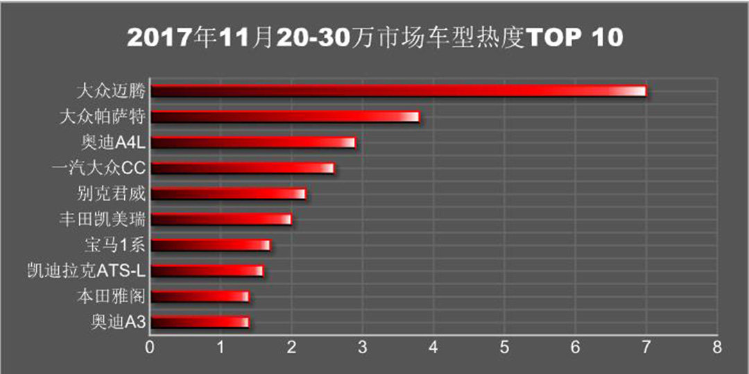 从以上20-30万的市场车型热度前十名的数据可以看出,排行榜上多数为一些主流的中型车,只有小部分的紧凑型车。毫无疑问的是这些中型车多数能够兼顾家用和商务两种场合,能够较好满足消费者的需求。由于大众迈腾和大众帕萨特两款车在国内一直充当着公务车的角色,自然而然给消费者留下了不错的口碑,更重要的还是经过改款后,整体的视觉感受更加年轻、稳重,降低了购车的消费群体的年龄。