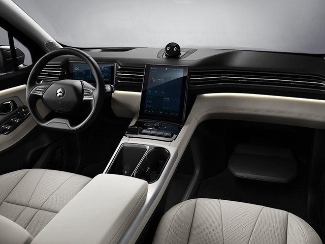 既然是一辆跨时代的电动车,内饰当然不能简简单单了。可以看到蔚来ES8的设计颇具未来感,双辐式多功能方向盘、全液晶仪表、中央立式中控屏等部件的采用令内部充满科技氛围。此外,整车采用了黑米双色的皮质包裹,在一定程度上提升了档次感。