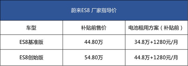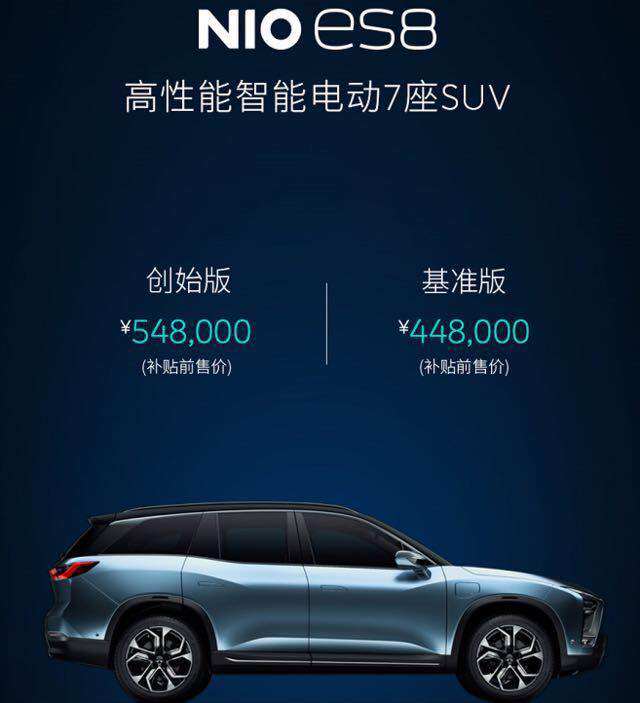 2017年12月16日,蔚来ES8正式上市。蔚来ES8共推出基础版和创始版两种车型,售价分别为44.80和54.80万元,计划于2018年3月交付。