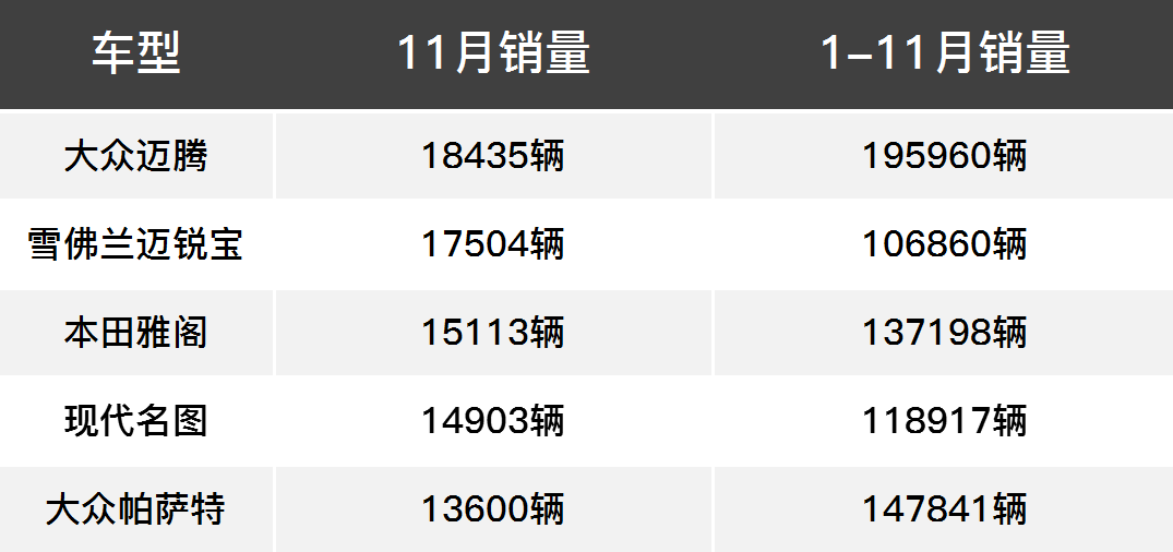 如果要问2017年中型轿车市场最大的赢家是谁,答案一定是大众迈腾。2017年1-11月,迈腾累计销量达到了19.5万辆,不仅甩开第二名帕萨特4.8万辆之多,而且也超越了去年中型车市场18.8万辆的单车年销量记录,创下了又一个新高。月均销量近1.8万台的迈腾几乎每个月都是中型车销量第一,几乎是碾压一般的存在了。