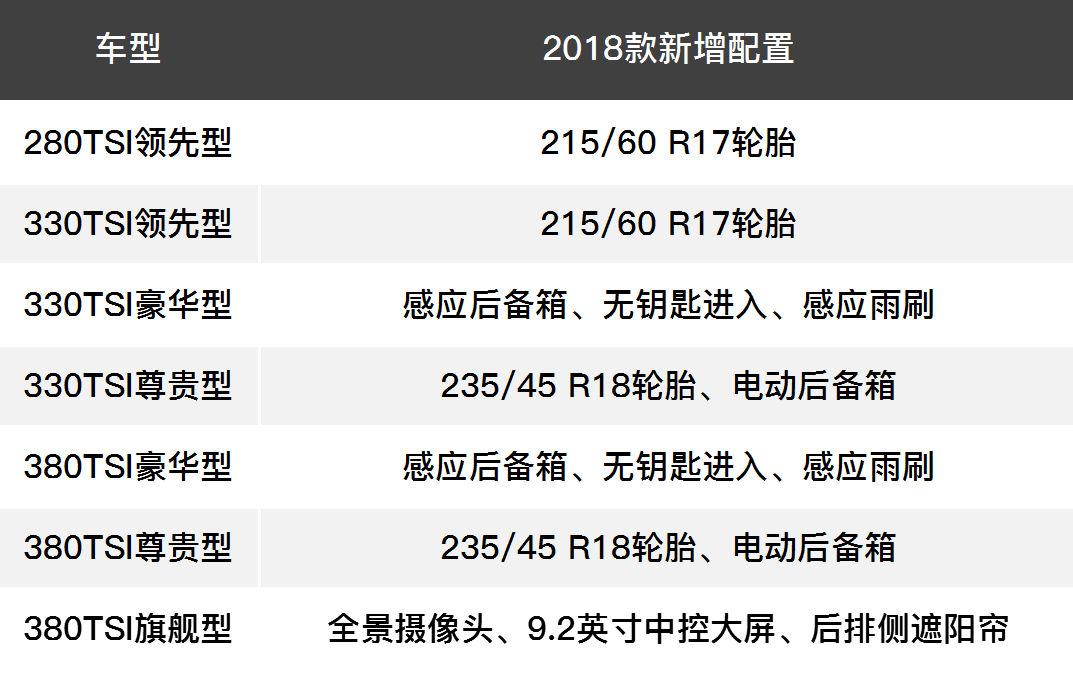 相比较老款车型来说,迈腾在售价不变的前提下,多款车型配置都有不同幅度的提升。而且配置的提升也是很恰当,比如说尊贵型升级了更大的轮毂和更宽的轮胎,不仅看起来更加有气场,而且安全性也有不小提升,电动尾门也十分优雅有档次,可以看得出2018款迈腾在配置上还是十分有诚意的。