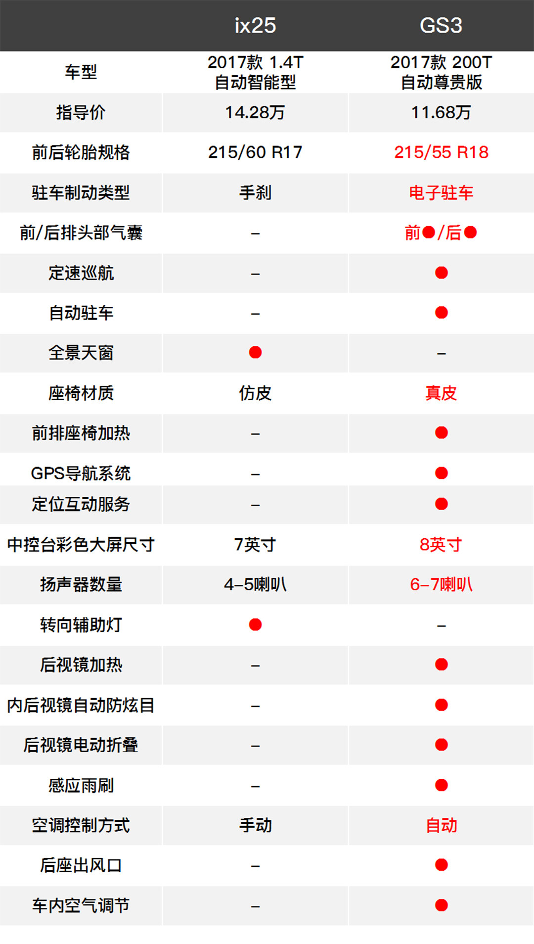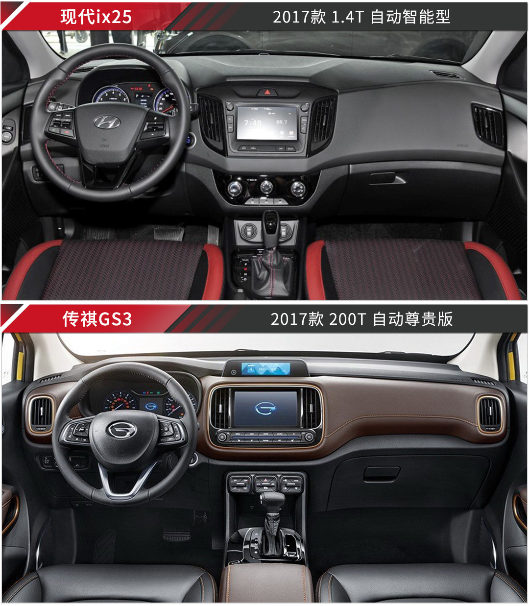 从对比表格中,我们也很清晰看到,现代ix25 好像只有全景天窗有比较明显的优势,传祺GS3要多出很多配置,而且很多都是实用性的,比如电子驻车、自动驻车、前排座椅加热等;