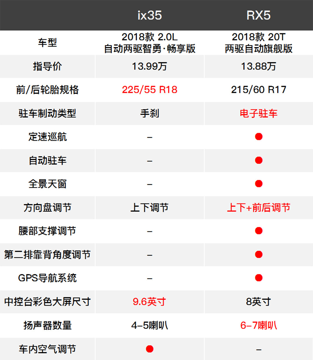 首先抛开两个车型都有的配置之后,两车配置的差异其实并不大,不过荣威RX5的车型配置也的确比ix35更有优势,比如电子驻车、自动驻车等,还有很多消费者都比较喜欢的全景天窗,ix35的这个车型都没有配置。