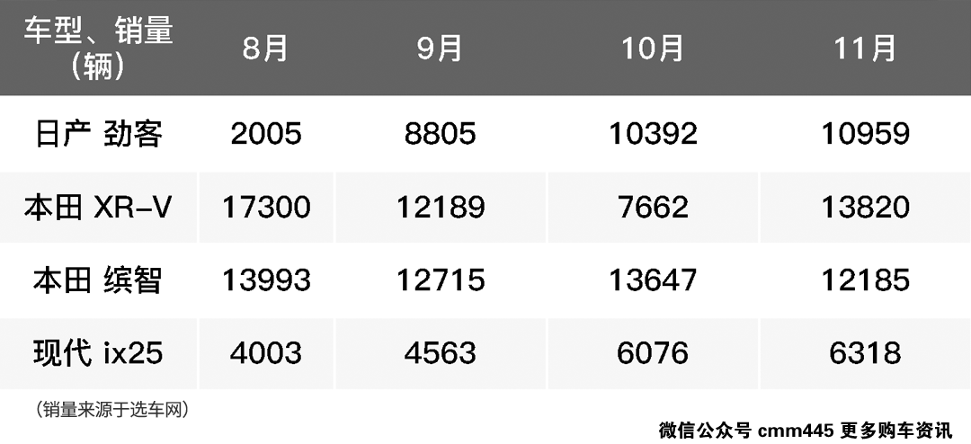 在合资小型SUV市场中,本田XR-V和缤智这对姐妹车型在销量上长期占据着头把交椅,而日产劲客这款车型自7月份正式上市以来,销量也一直稳步上升。