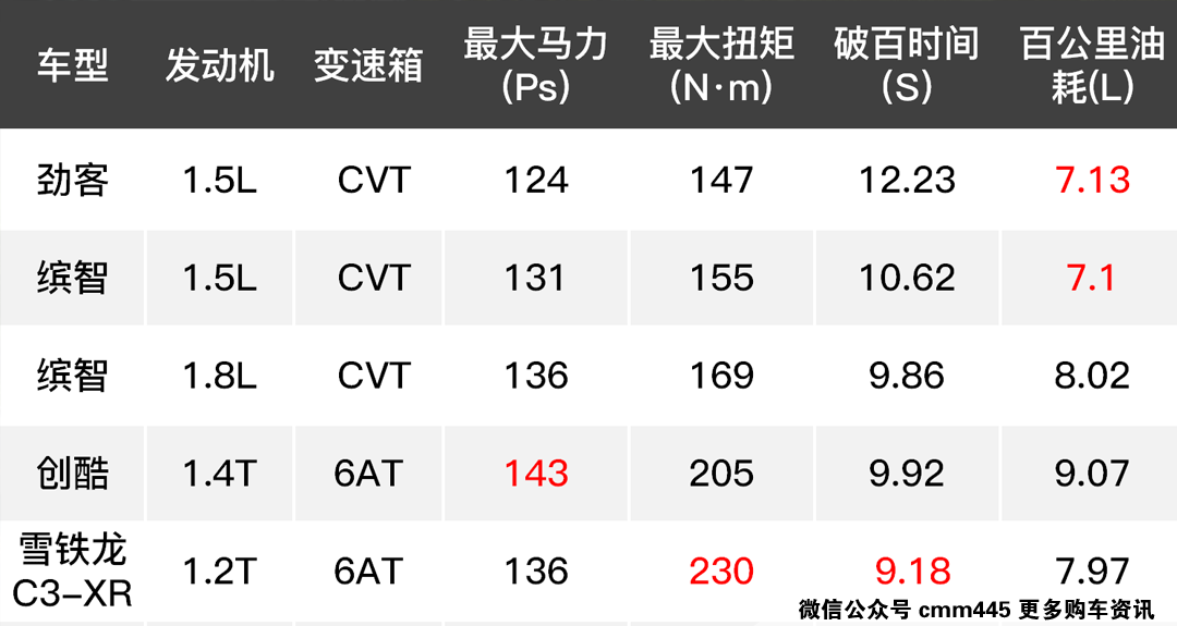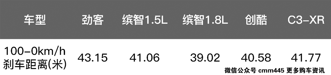 大家能从表格上能直观看到,在动力系统方面劲客仅在用户口碑油耗方面占有优势,其12.23秒的破百成绩的确是过于平庸,尤其是面对搭载地球梦技术的缤智1.5L车型,同时创酷和C3-XR这些车型早已搭载了小排量增压发动机,动力性能比劲客有明显优势。