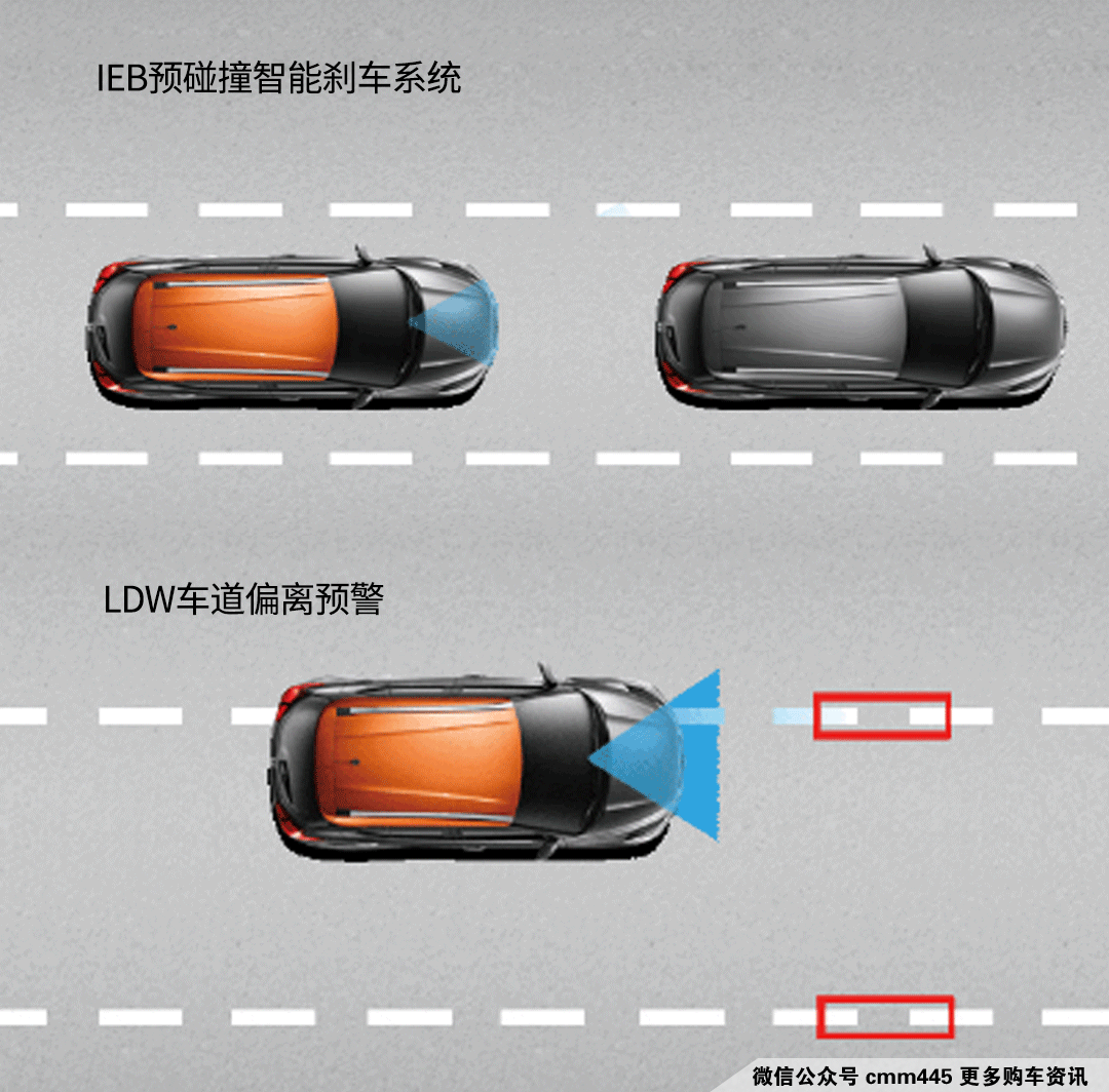 IEB预碰撞智能刹车系统通过车前方摄像头实时监测车辆前方的行人或车辆潜在碰撞危险,遇到危险会及时预警,必要时自动刹车。其作用速度为10-80km/h,当然了这项配置更多是起到辅助作用,不可完全替代驾驶员的操作,但在车流复杂的市区还是能降低追尾概率。