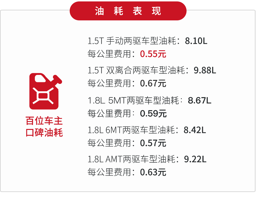 1.8L车型的整备质量为1375kg到1470kg,整体算是控制得颇为出色。得益于颇为出色的车重控制,1.8L车型才有现在的油耗表现。而6挡手动要比5挡手动节省了0.25L/100km的综合油耗,效果也算是有目共睹。不过,1.8L车型只有AMT变速箱作为自动挡,开起来还是较为一般。