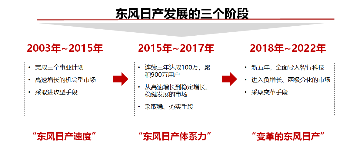 2003年到2015年,中国入世初期,处于高速增长的机会型市场,东风日产抓住了机遇,通过狼性团队文化、进攻型的市场手段、完善的产品规划和高效的管理方式,巩固了位居行业前列的市场地位,也在汽车行业留下了一张名为‘东风日产速度’的独特名片”。
