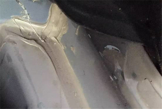 而如果有发生过重大追尾事故的,一般都需要切割、重新焊接。那么就需要人工重新打胶。记住一点,人工打胶是远远不能跟机器打胶相比的,所以人工打胶是一团一团且不均匀的,而且颜色也会有差异。