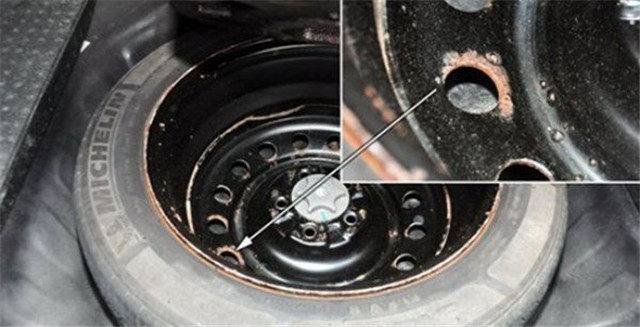 那么这时候还是来到后备箱,记得刚刚被你拿出来的那个备胎吗?水泡过的备胎轮圈肯定是生锈的,而且很少车主在修复车辆时会顺便把备胎换掉。