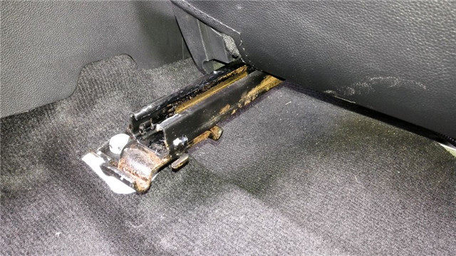 还有就是座椅底部的铁轨,就是调节座椅前后那条,由于位置比较已隐蔽,比较少人会关注到,而修理厂也会直接不管,一般洗车的人都不会擦洗那条铁轨,所以有生锈痕迹的基本上就能确定是泡过水的,而且泡得很严重,已经进入车内了。