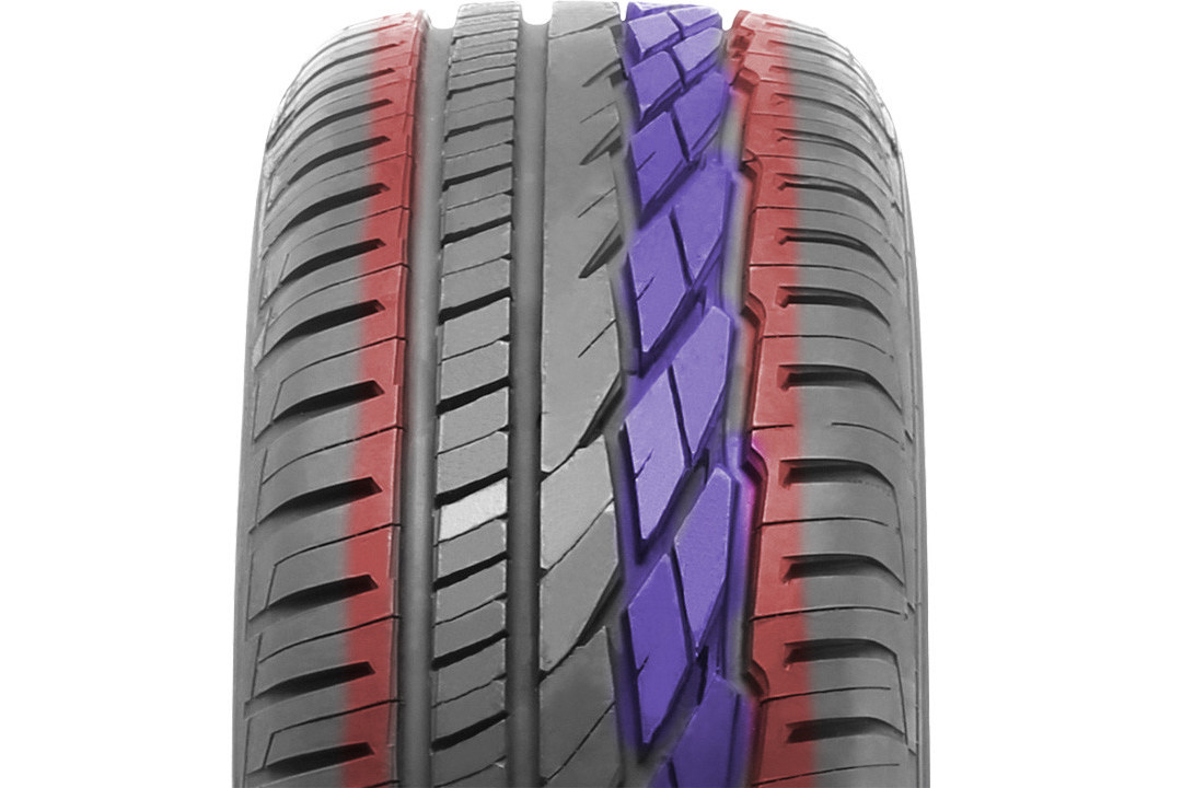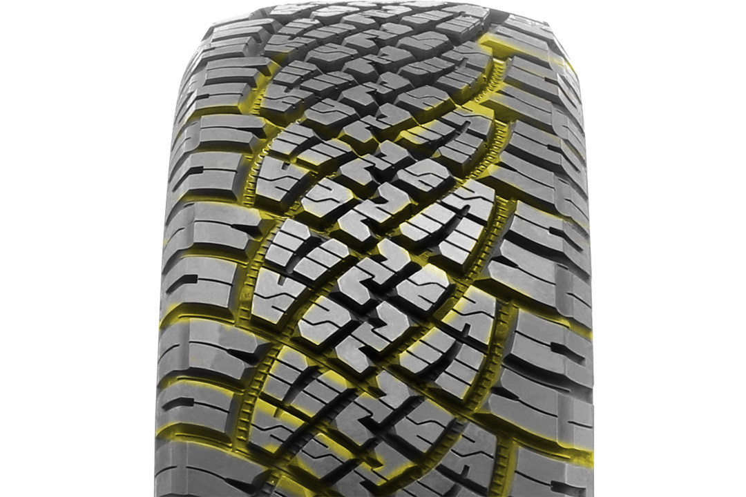 2、 胎肩设计使用了交错的花纹块和中央大角度花纹块,能够有效传递横向和周向力提升轮胎牵引性和响应性。