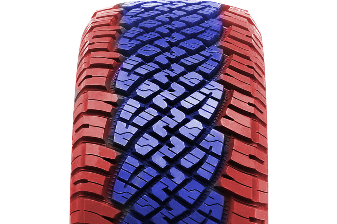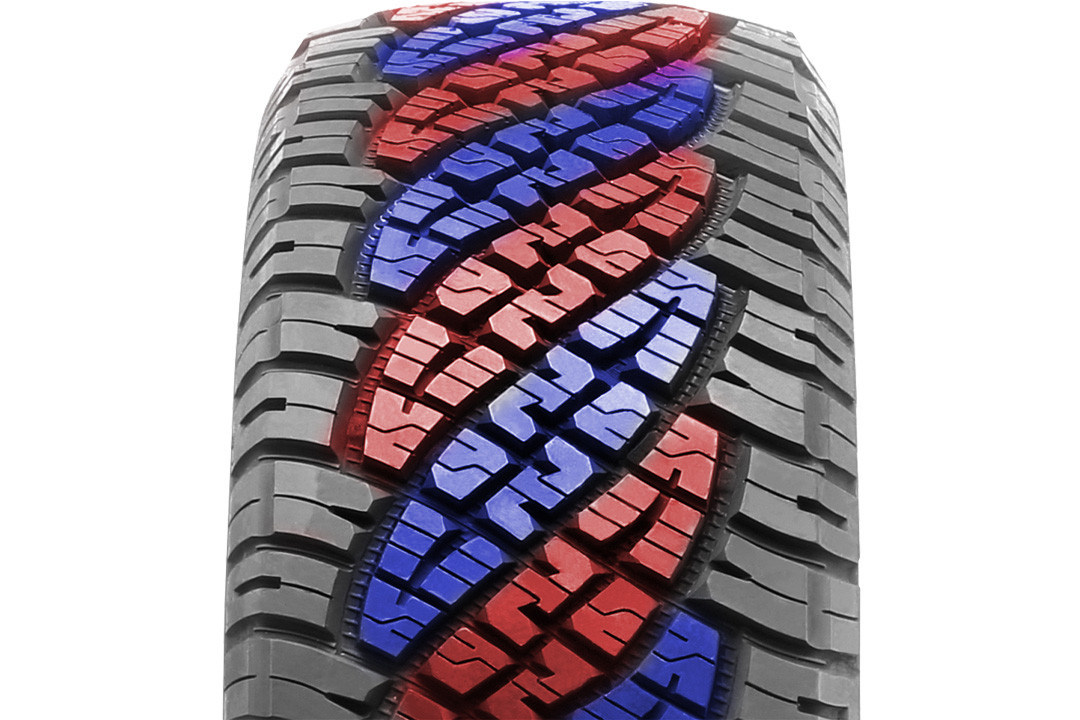 4、 V型交错的胎纹设计设计可以优化沟槽应力分布,让胎面磨损更均匀,同时带来更高的坚硬路面的抓地力和响应性。因此GRABBER AT5更适用于对一定越野能力有需求的玩家。
