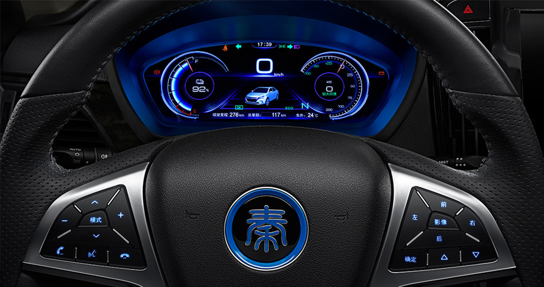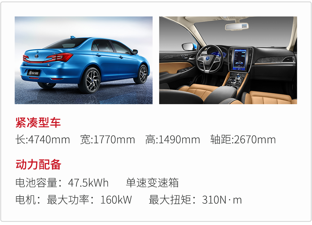 在动力方面,秦EV300采用纯电动系统,使用的是磷酸铁锂电池,官方宣称拥有300km的续航里程,电池组质保为6年或者15万公里。其电机最大输出功率为160kW,峰值扭矩为310牛·米。使用220V慢充接口可在7个小时左右充满电,可以使用家用220V电源充电,在野外还可以使用车辆自身的电量实现车外220V交流放电功能给用电器供电,这是很赞的。使用380V快充接口可在1-2小时内充满电,配合单速变速器,驾驶的平顺性还是非常不错的。