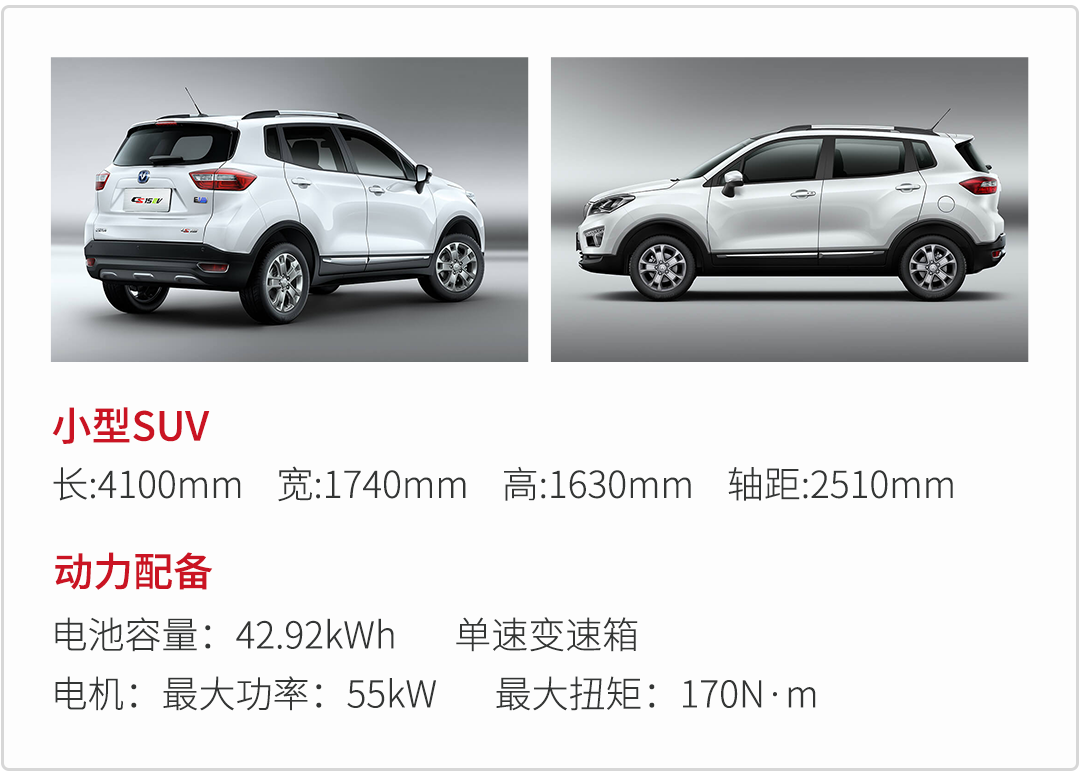 CS15EV采用容量为42.92kWh的三元锂电池,质保期为8年或者12万公里,综合工况续航里程为300km,60km/h匀速工况下可达350km。快充模式下,充至80%电量需要45分钟,慢充则需要11.5小时充至慢电,而使用家用充电桩充满电则需要13.5小时。