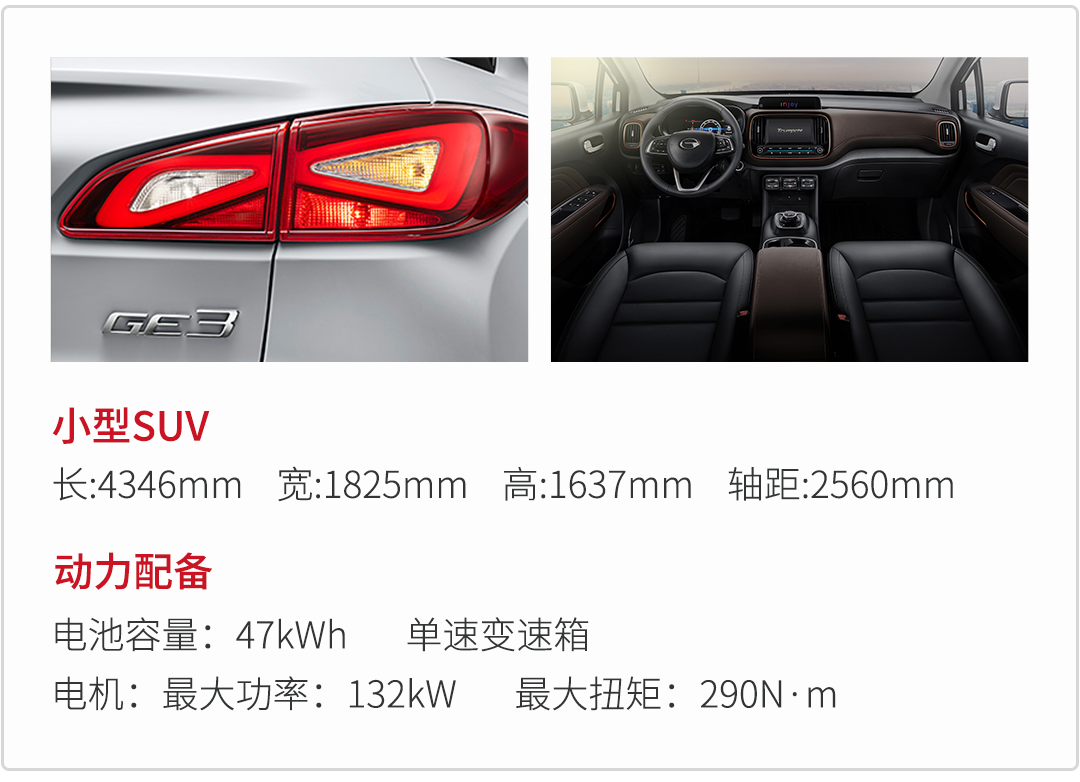 传祺GE3采用电池平整化布局,将电池组设计在车辆底部位置,能够使车内空间表现更佳,同时能够降低整车重心,采用三元锂电池容量为47Kwh,如使用新一代传祺快充技术,在30分钟内就可将电量充至80%,使用慢充的话则需要8小时,官方宣称的续航里程为310公里,60km/h匀速工况下续航里程可达475公里,电池组质保为8年或15万公里。