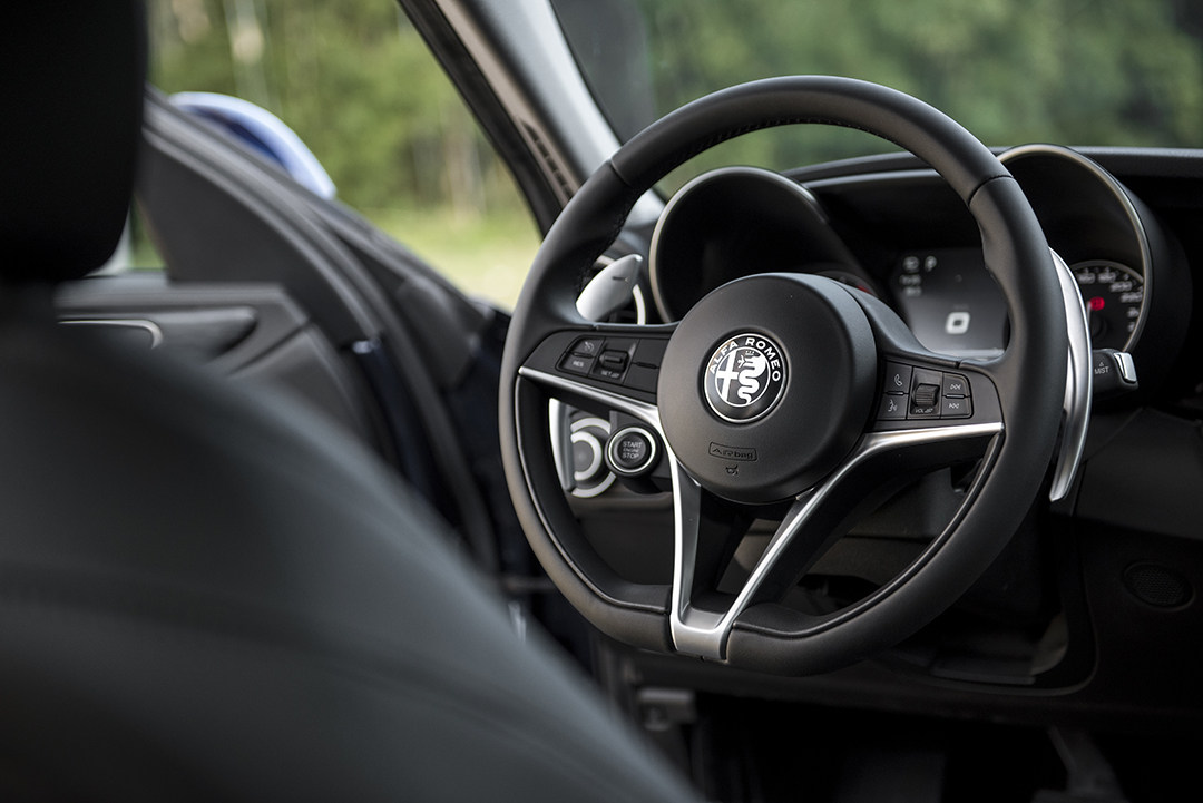 Giulia的转向灵敏度极高,方向盘响应非常迅速,电子助力的方向盘只有1.5圈的转动幅度且力度非常轻,甚至只需要一只手指就能完成一次倒车入库;不过在转换至运动模式或随着车速的逐渐提升,转向力度也会变重;这种力度变化能带来使用上的便利,但缺乏真切的机械连接感,路感也稍弱。