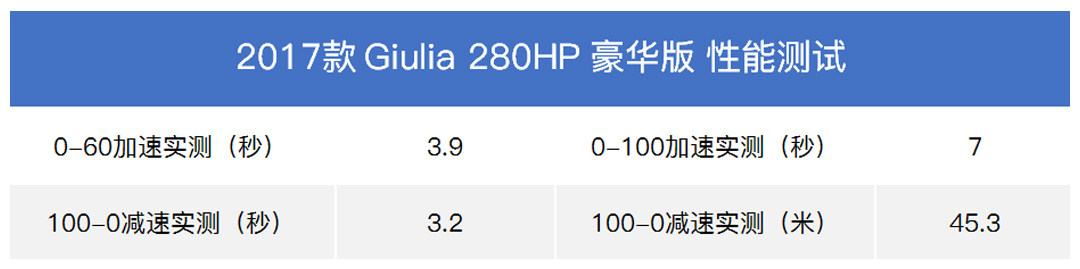 在阿尔法罗密欧的官方介绍中,Giulia 280HP豪华版的0-100km/h加速成绩可以达到5.2秒,如果单从其动力数据以及车重水平考量的话,做出这个加速成绩其实并不令人意外;但是当我们真正启动手中的Giulia并全力加速时,我们得出的0-100km/h加速成绩却是7秒,而从100km/h全力刹车直至静止则用了整整45.3米。