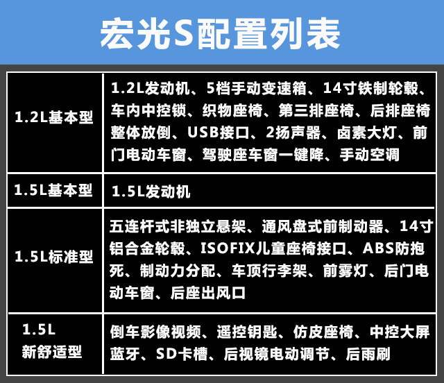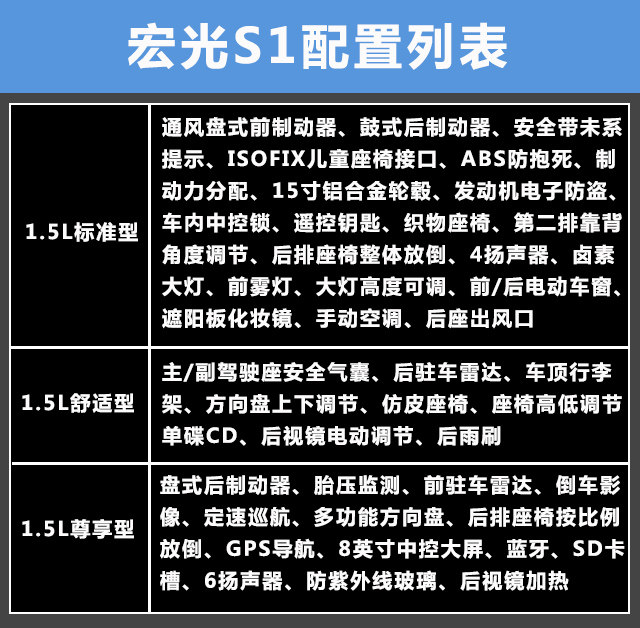 宏光S1车型的配置表也是一样的,1.5L标准型写的是全部的配置,下面两款车型写的是对比上面一个车型的增加配置。