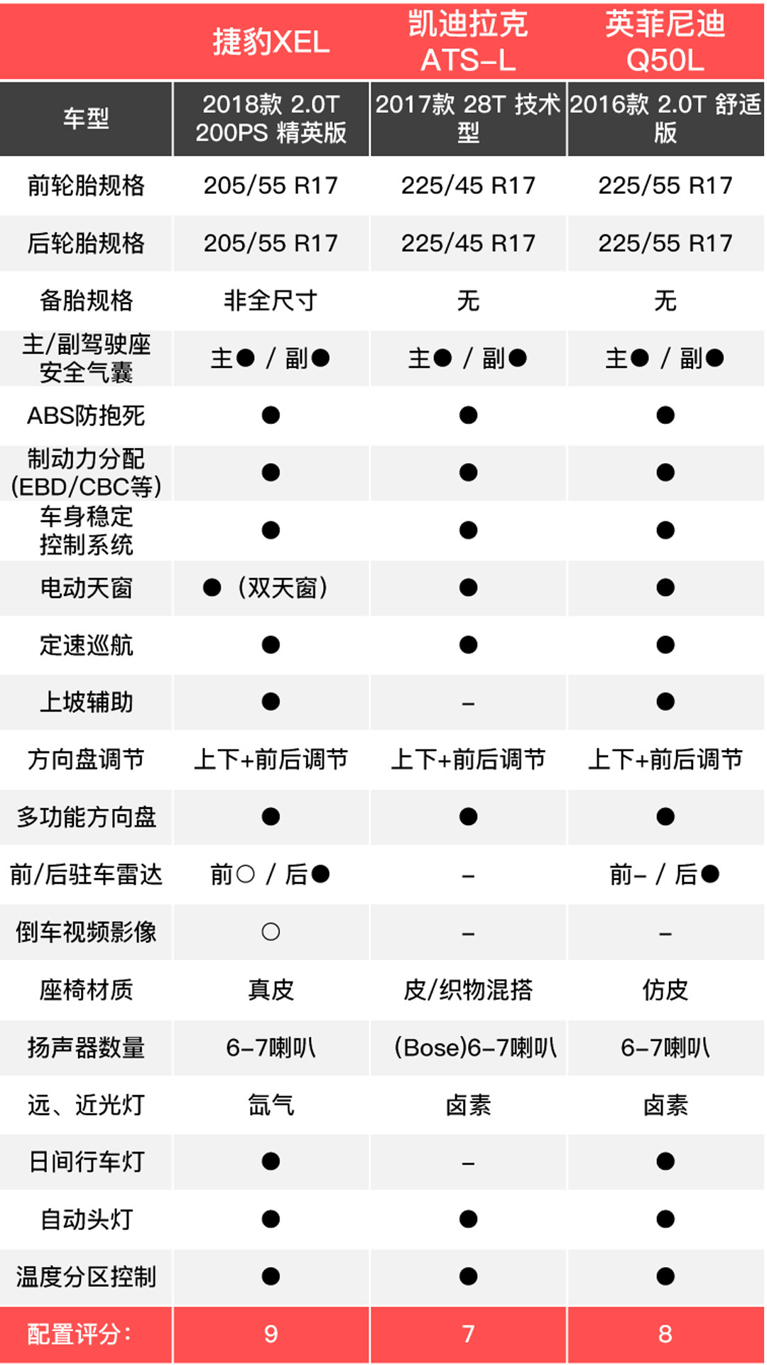 其次,作为一个后来者,捷豹XEL的配置明显更有诚意。例如我今天选取了三款车型的入门版本比较,发现XEL的入门版本足以满足日常的需求。XEL的入门版本配备了双天窗、真皮座椅、氙气大灯实用性更出色,而对手依然入门车型仍然采用卤素大灯,实在与其豪华车型的身份有些不符。