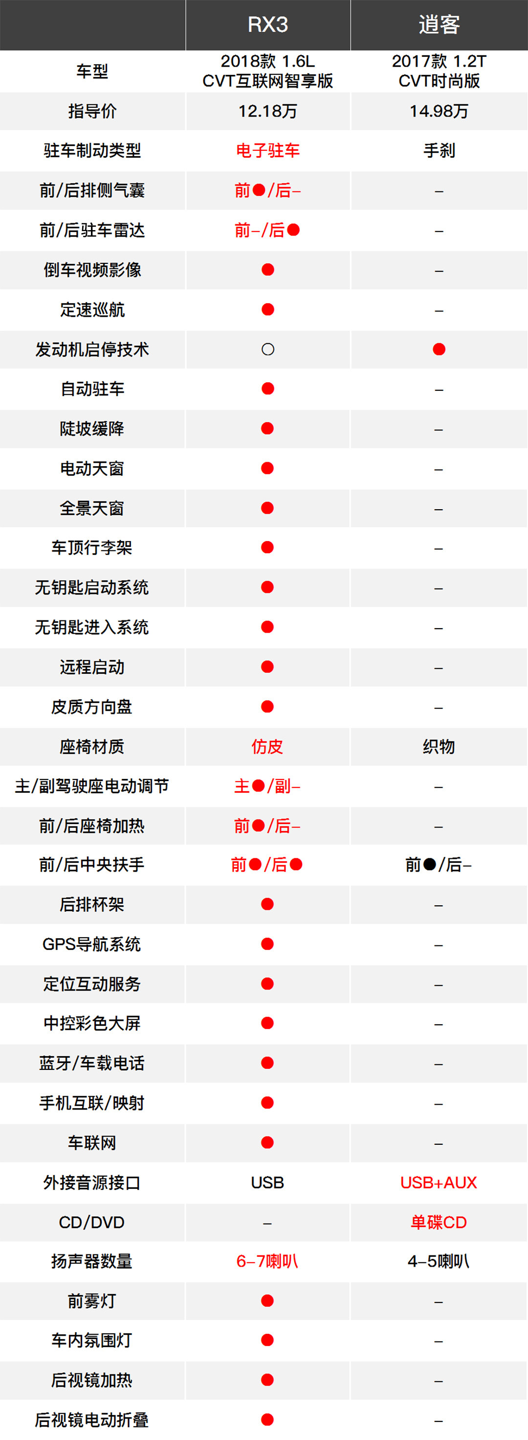 通过配置对比,逍客可能真的要炸了,为什么差距这么大,而且对比车型中,逍客还比RX3要贵,同时在RX3的配置表上也可以看出,荣威真的太良心了。