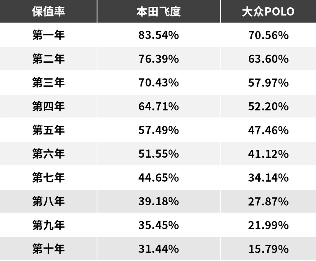 通过对两款车型的保值率进行对比,本田飞度在保值率上完胜大众POLO,这也恰好证明了“销量很高的车型,保值率不一定非常突出”的观点。我们以前五年的的保值率来看,飞度的第五年的保值率仍然能够保持在57.49%,大众POLO的第五年的保值率只能保持47.46%,两款车型的保值率几乎相差了10%左右,但是这10%的保值率却能影响着消费者换车的预算。