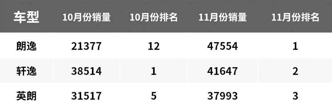 而十二月份中旬一过,十一月份的汽车销量排行榜随之出炉,这对于一些想要在春节前购车回家过年的消费者们有很好的选车参考作用(其实是让一些消费者犯选择困难症),这个月的榜单还是挺有意思的,朗逸十月份爆冷跌出榜单前十,颇有“一夜回到解放前”之势,而在十一月朗逸强势回归,又夺得轿车销量榜第一的桂冠,而轩逸则是在第二,表示高枕无忧,最近刚刚完成更新的全新英朗,则是一举攻下第三的位置,表现可圈可点。