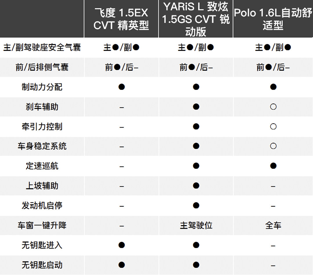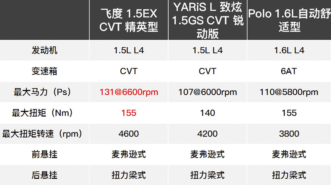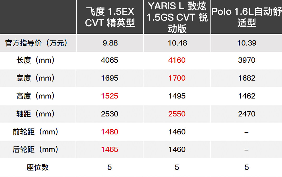除了YARiS L致炫和Polo,我们还找来售价9.88万元的飞度1.5EX CVT精英型进行空间、发动机和配置上的对比。
