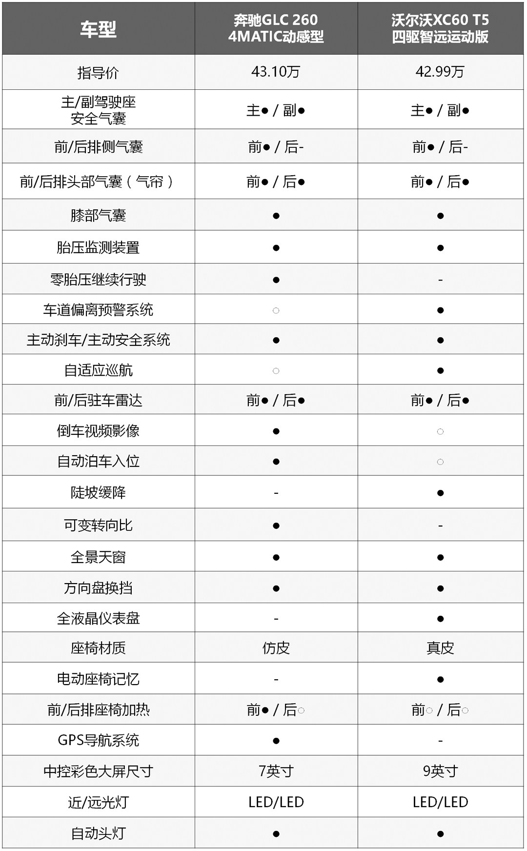 两车的配置方面也比较接近,安全配置都很出色,不过也有点差异,奔驰GLC比沃尔沃XC60多了零胎压继续行驶、倒车视频影像、自动泊车入位、可变转向比、GPS导航、前排座椅加热等,沃尔沃XC60比奔驰GLC多了车道偏离预警系统、自适应巡航、陡坡缓降、全液晶仪表盘、电动座椅记忆等,比较下来,总体上奔驰GLC的配置相对更丰富一点。