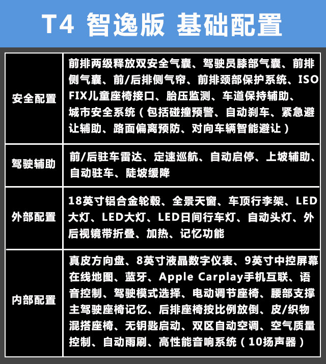 看下最低配的T4 智逸版配置,安全配置十分厚道,其他日常舒适性配置也都有,性价比超给力。