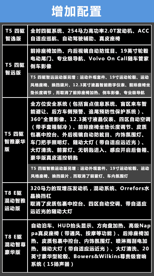 入门的最低配,在安全配置方面下足了本,这也是沃尔沃一向主动的卖点,我的车就是安全。其他配置,LED大灯、全景天窗、中控大屏、定速巡航、自动空调、电动座椅等等能满足日常舒适性的配置都已经有了,两驱和低功率的发动机也足够城市使用,不用多说,满五星推荐。