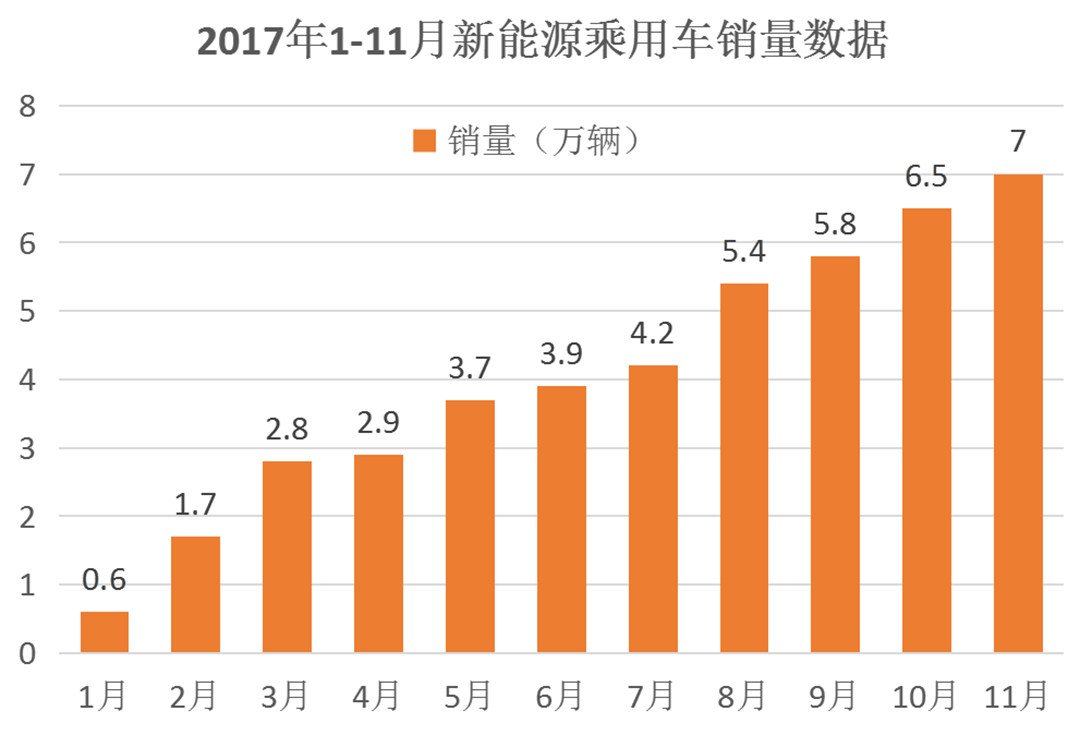 由于各种阴差阳错(CAFC咖啡法规、新能源补贴、摇号上牌等等),新能源汽车2017年内的销量持续上升,11月新能源乘用车销量已超过7万辆。
