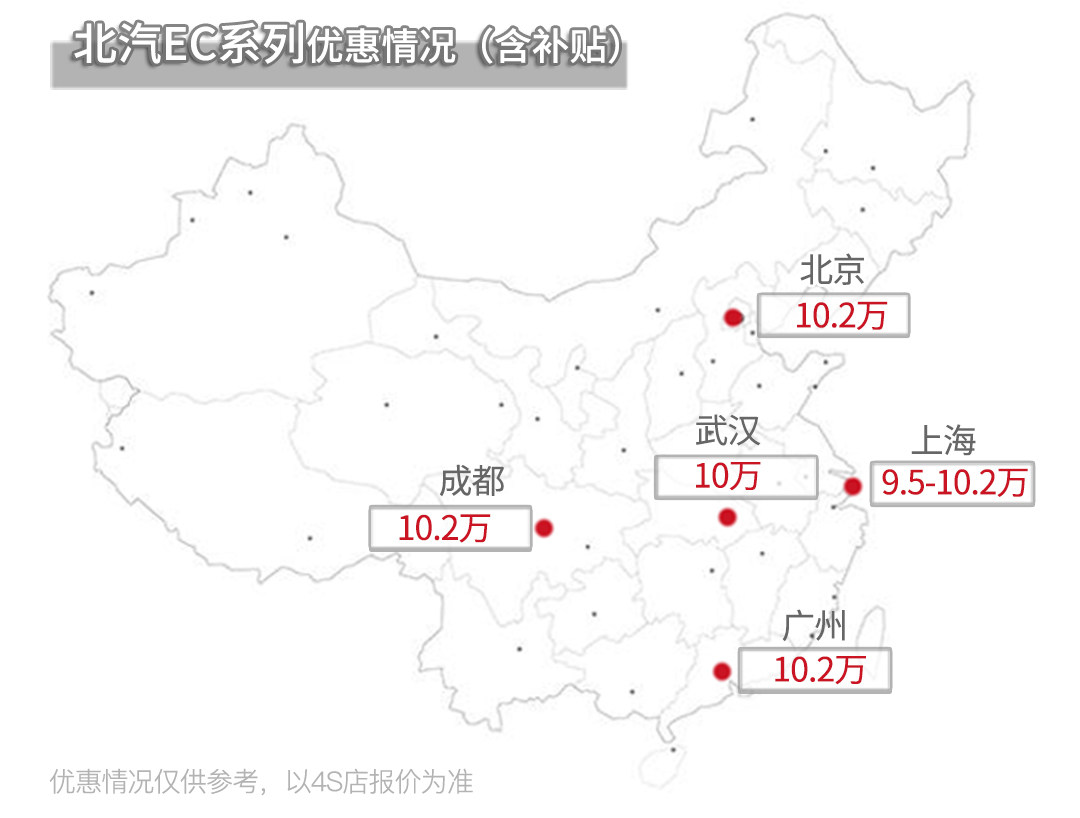 在上市初期,北汽新能源EC180就以国家补贴3.6万,地方补贴1.8万的基础上增加了4.8万的企业补助,最终以4.98万和5.58万的价格得到了广大用户的肯定。
