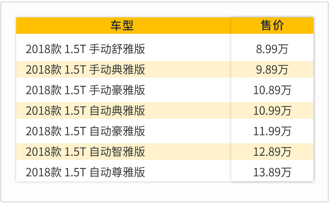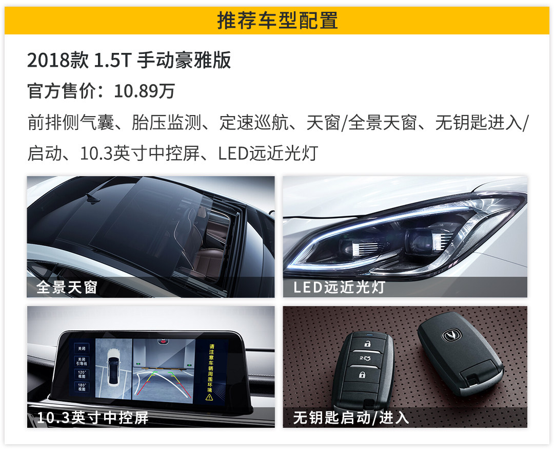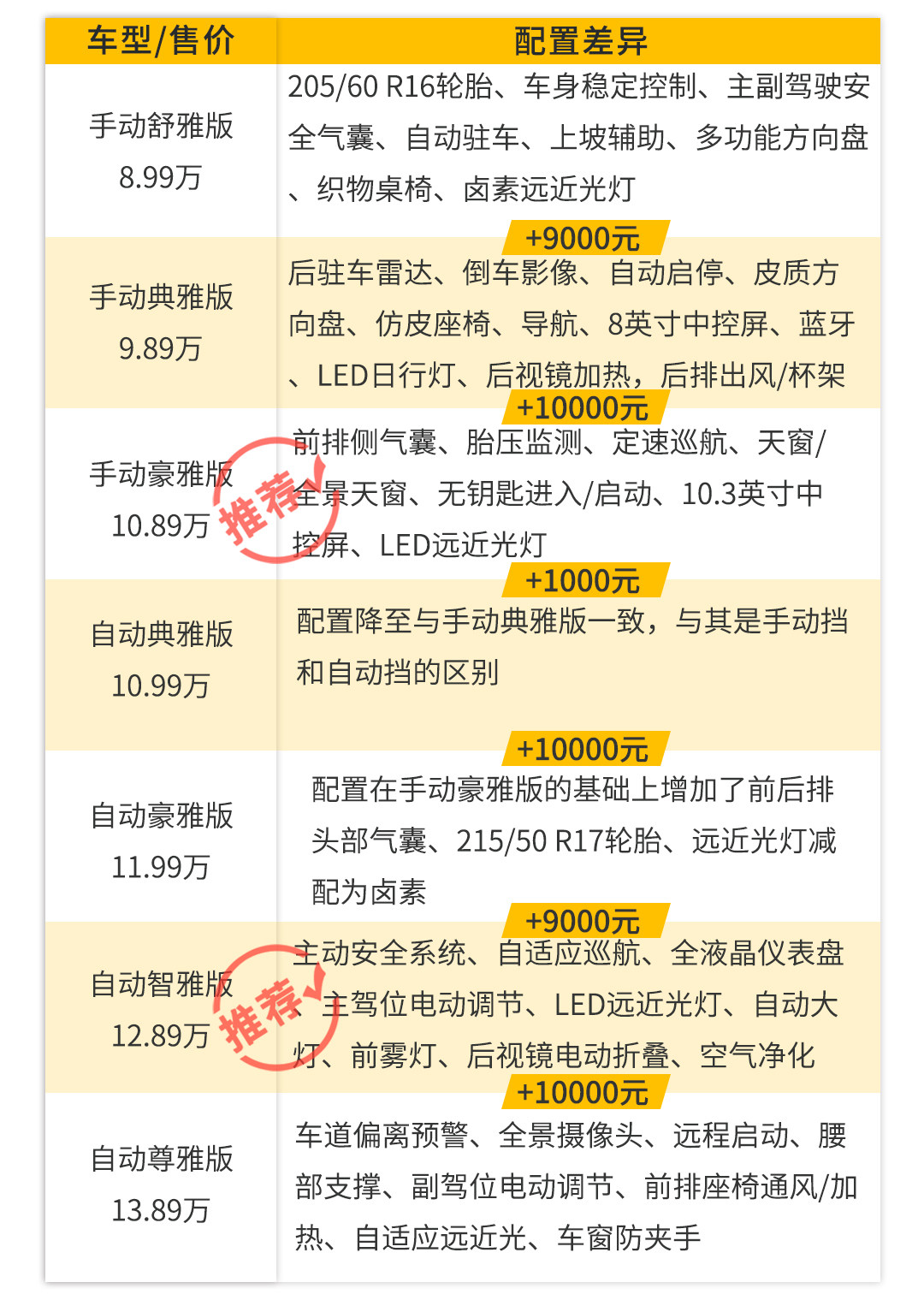 全系都是1.5T,那么只剩下手动挡和自动挡配置的选择了,教授比较推荐手动挡车型的顶配,自动挡的次顶配;大家都喜欢的天窗/全景天窗是手动豪雅版以上车型都有,既然一款中型轿车,推荐尽量增加舒适性配置,日后用起来舒服而且不会掉档次,比如定速巡航、无钥匙进入/启动都是比较实用而且值得买的配置,所以推荐手动挡的顶配。自动挡其实顶配和次顶配都值得买,次顶配就有主动刹车系统,自适应巡航等科技配置,而顶配才14万不到,配置进一步提升,全系摄像头、座椅通风/加热、车道偏离预警等,都是性价比非常高。