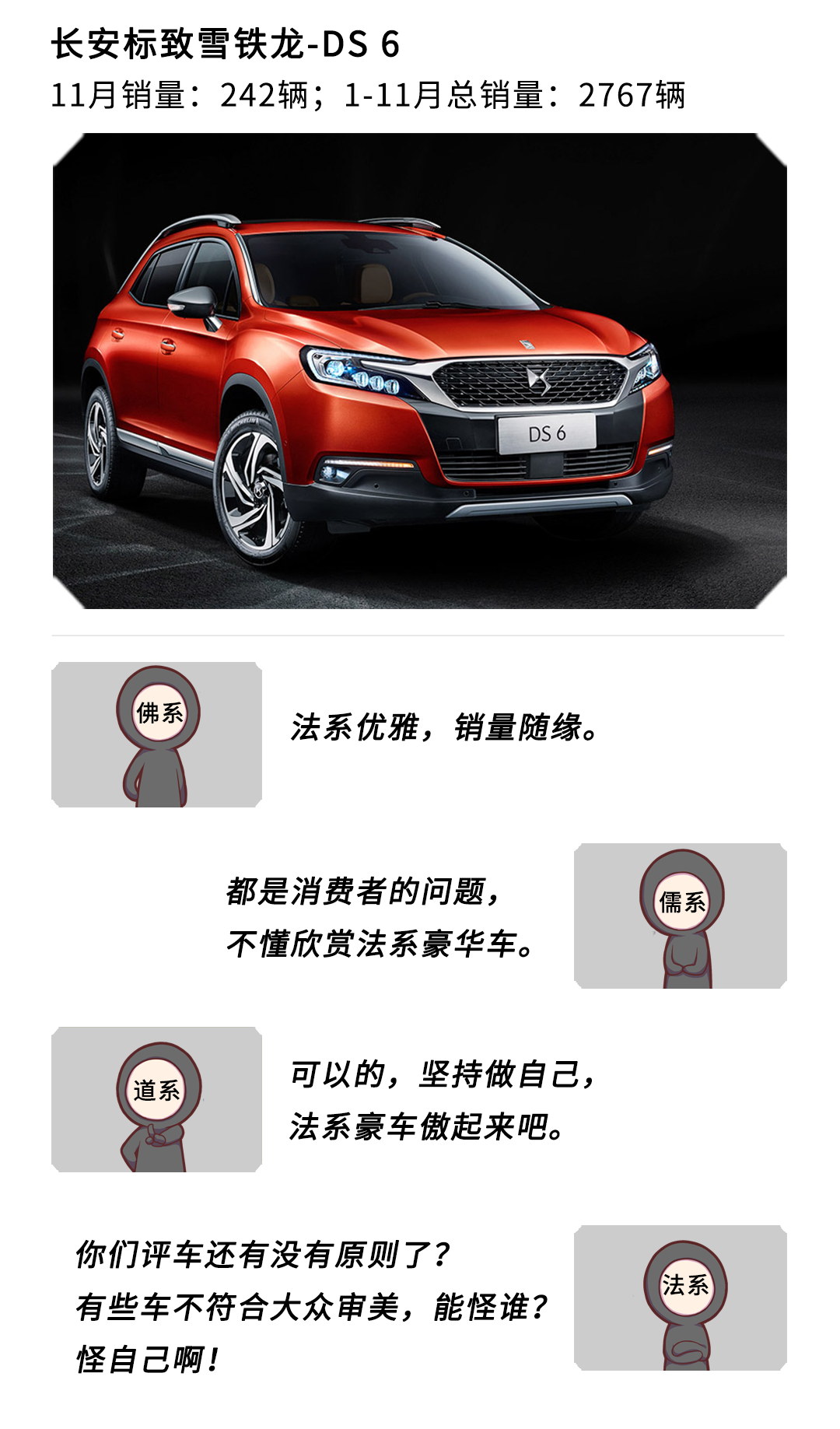法系+豪华,这两个定语就注定了DS6销量的惨淡。首先法系品牌在国内本来就不太受欢迎,东风标致靠高颜值拉高了关注度,但是DS作为一个豪华品牌却没有成功地引起注意。虎哥认为,这跟它的品牌调性和设计理念没有太大的关联。