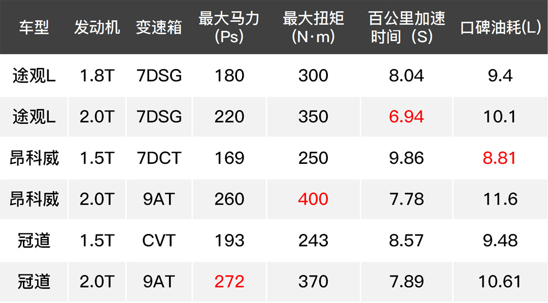 从以上三款主流中型SUV车型的动力对比表中我们能直观看出,途观L的1.8T车型破百时间仅需8秒左右,已然是一个突出的成绩。而2.0T车型更是跑进了7秒内,这大部分功劳要归功于出色的发动机、变速箱匹配。