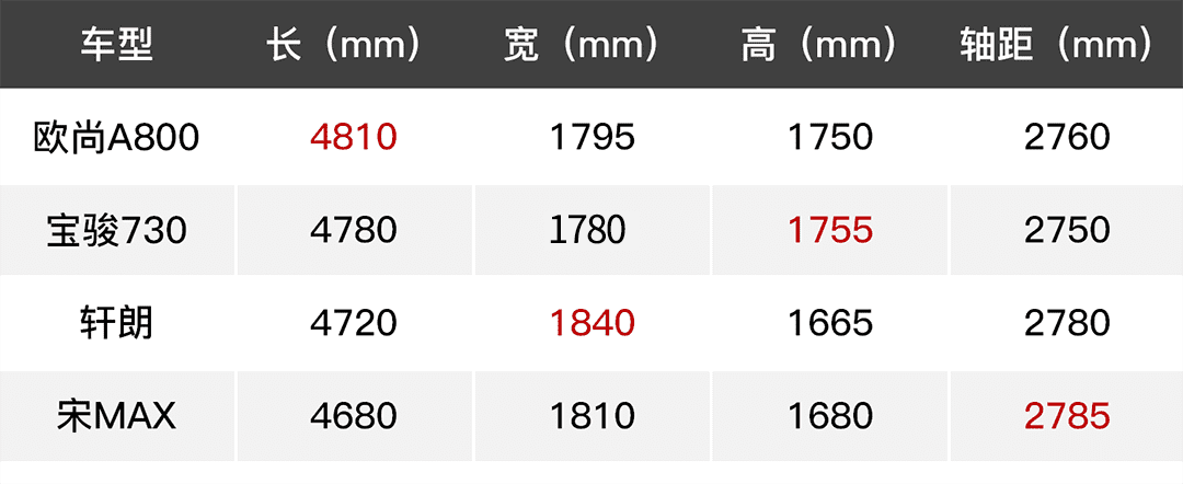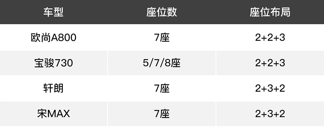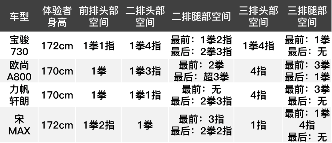 由上面的表格可以看到,宋MAX的空间表现是最一般的。而力帆轩朗的空间看似很大,实际上二排座椅调至最前时,一点腿部空间都没有。宝骏730与欧尚A800的挖空间能力都颇为惊人,宝骏730的头部空间更佳,而欧尚A800的腿部空间更好。
