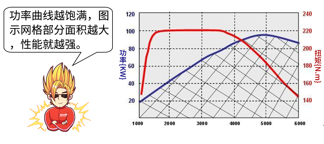 那么是不是最大功率一样的发动机,其在加速性能上就一样呢?如果说一样就不够严谨了,毕竟只是最大功率一样,其他譬如最大功率在什么转速出现、其曲线走势如何都是不清楚的。如下图所式,一台车性能的表现不止要看最大功率,严谨点的说法就是看功率曲线。而这条功率曲线所包含的面积,可以看做是加速度在时间方向上的积分,面积越大则代表加速性能更好。