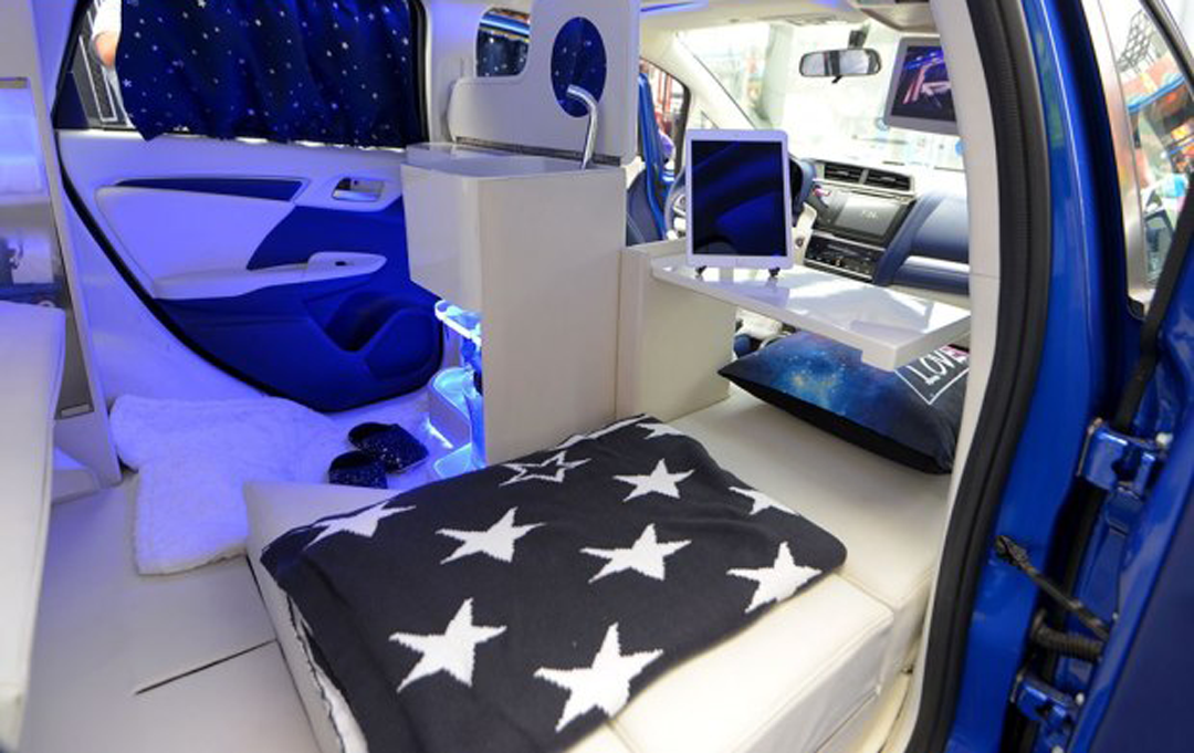 放眼望去,如果遮住车标,很难相信这是一辆飞度。蓝白的主色调看上去有点奇妙,副驾驶位多了个多媒体影像,娱乐性不错。后排的位置改动幅度更大,座椅直接被拆,变成了沙发、洗漱台和吧台。此外,副驾驶座椅也被拆掉了,变成一张小书桌,整个改装的脑洞颇大。