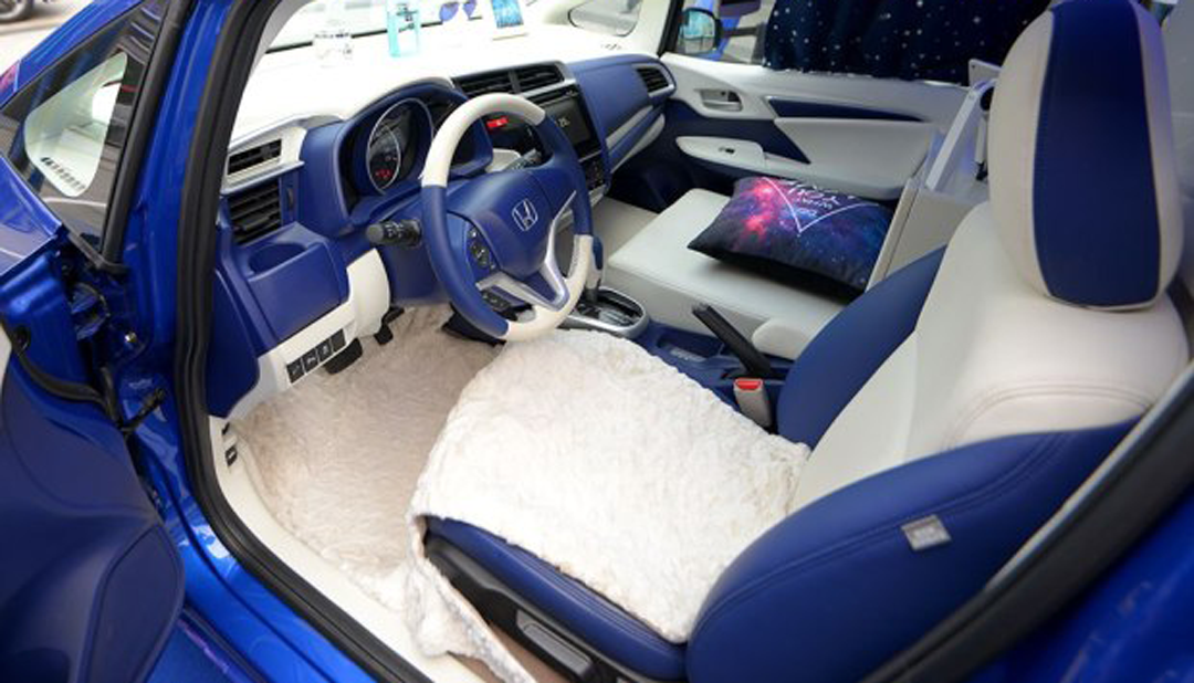 除了民间改装以外,还会有一些厂商方面的改装,看上去还是蛮有趣的。像这台“Fit House”,车身采用了拉花设计,但略显突兀,轮圈则被喷成蓝色,而重点是在内饰的改变上。