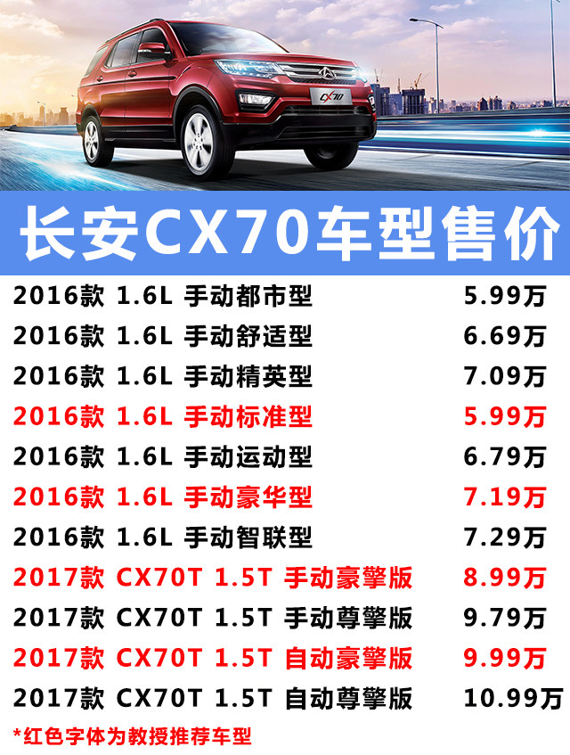 长安CX70经过一些车型的增减后,在售车型有些混乱,这个车型售价表是根据官网配置&售价表制作的,教授最为推荐的是1.5T的手动豪擎版以及1.6L的手动豪华型。其次推荐1.5T的自动豪擎版、1.6L的手动标准版。