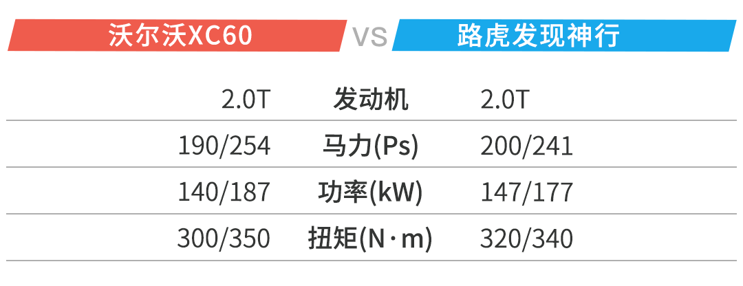 两款车都是以2.0T涡轮增压发动机和8AT手自一体变速箱作为动力总成,而且都是有高低功率之分,XC60的高功率发动机甚至比发现神行的动力参数更胜一筹;可以说在动力总成的比对上二者不分伯仲;只是在实际驾驶体验中,路虎发现神行的旋钮式换挡机构也许显得比XC60的传统挡杆可玩性更高。