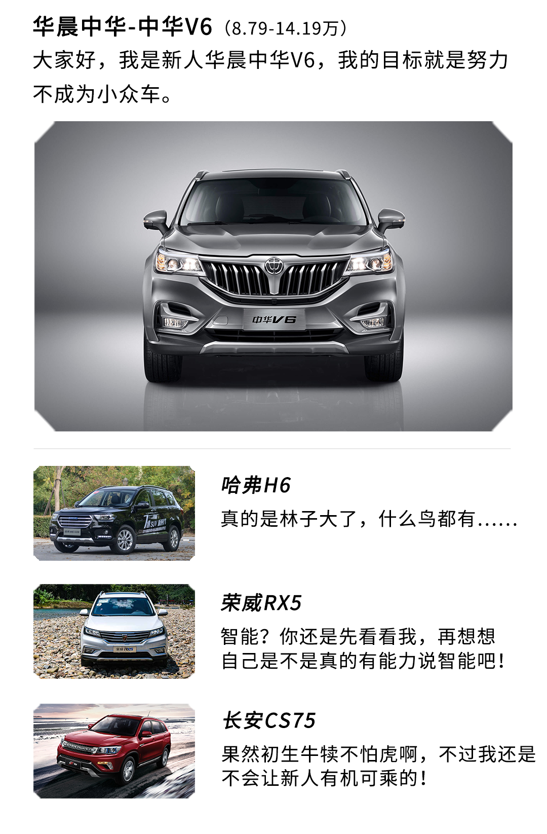 中华V6:请问,你们听说过宝马吗?我们家可是宝马在中国热销的先决条件之一,除此之外,我诞生的工厂也是严格按照宝马生产标准打造的国际化车间,而且生产研发团队也有这宝马本部的人员支持,在宝马技术的依靠下,我这刚上市不久的紧凑型SUV可不是同级别车型可以轻视的强劲对手。