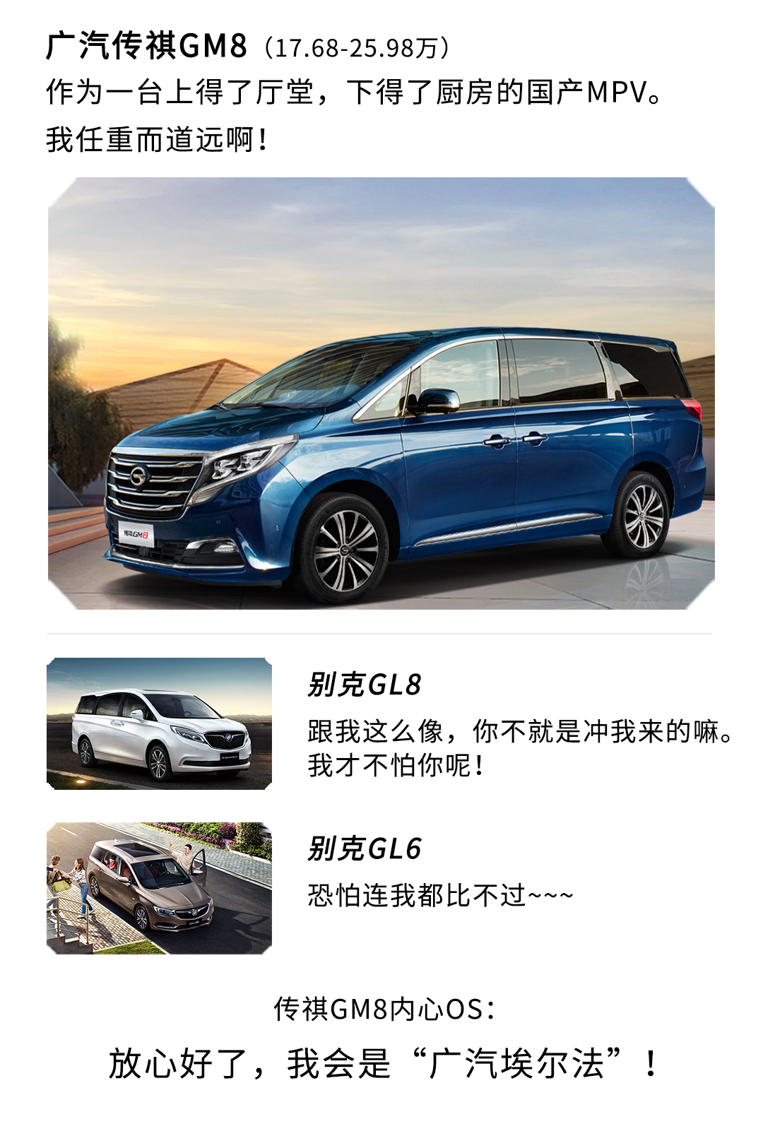 传祺GM8:业内都说,中国是MPV的福地。但恕我直言,中国卖得好的MPV那基本上都算是微面。真正走中高端路线商务化的MPV车型可以说少之又少,但我的到来就是为了打破这个局面,与我同平台的GS8在家用SUV市场已经奠定了良好的口碑和庞大的消费人群;而我同样以高颜值的形象出现,一定会在自主品牌中高端化商务车的领域再一次成为业界领头羊!