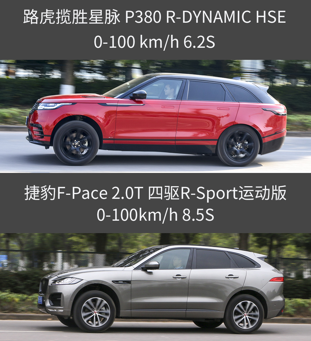 如果只看测试数据,采用3.0T发动机的揽胜星脉P380 R-DYNAMIC HSE当然更加强大,但揽胜星脉在起步时抬头现象非常明显;而捷豹F-Pace的车身姿态则更加稳定,可见捷豹F-Pace的悬挂系统支撑性更好,更偏向运动性。