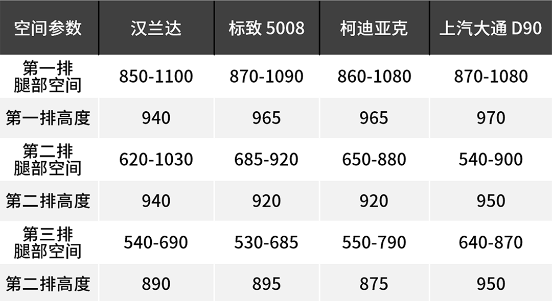 首先今天要推荐的三款SUV空间表现都不错,与汉兰达的空间参数相比也差不到哪去: