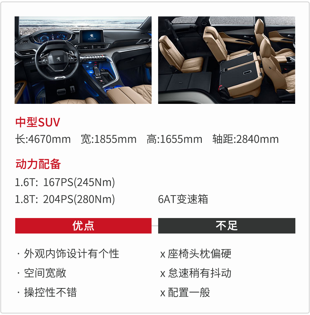 同时它不仅空间宽敞,开起来也是十分顺心的,其中主销车型1.8T发动机转速超过1500rpm即可爆发最大扭矩,起步与加速阶段油门响应积极,6AT变速箱换挡平顺,同时悬架调校的很有韧性、转向助力轻巧,很适合市区代步使用。但是标致5008是全系没有四驱系统的,所以想去郊外撒撒野的朋友可要收收心。