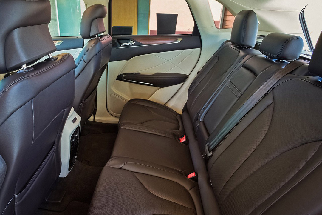 内饰方面,林肯MKC的用料和做工都非常厚道,例如门板内衬和扶手采用真皮包裹,车顶使用Alcantara复合材质,座椅填充柔软,前后排头枕都有林肯logo的刺绣,非常精致。不过可惜的是,虽然林肯MKC定位于中型SUV,但它的后排空间确实比同级竞品车型要小一点点。